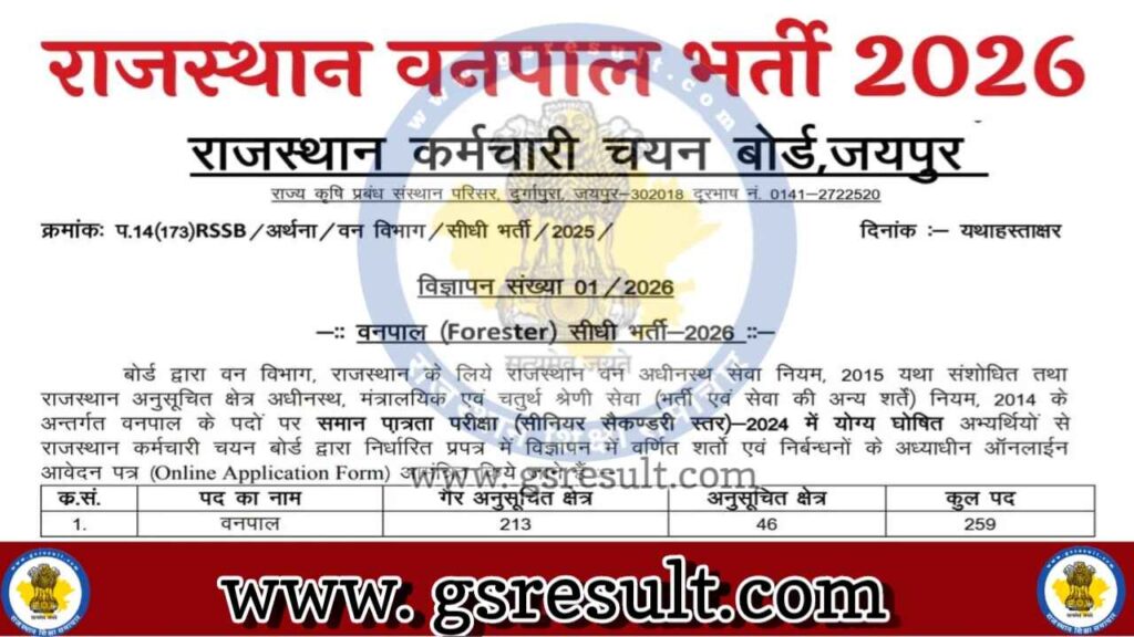 Rajasthan Forester Recruitment 2026: राजस्थान कर्मचारी चयन बोर्ड ने वनपाल भर्ती 2026 का नोटिफिकेशन जारी कर दिया है राजस्थान में वनपाल के 269 पदों पर भर्ती आयोजित की जाएगी जिसके लिए महिला और पुरुष दोनों अभ्यर्थी आवेदन कर सकते हैं इसके लिए अभ्यर्थियों को एसएसओ पोर्टल के माध्यम से ऑनलाइन आवेदन फॉर्म भरना होगा राजस्थान वनपाल भर्ती के लिए आवेदन 6 जनवरी से लेकर 4 फरवरी 2026 तक भरे जाएंगे।